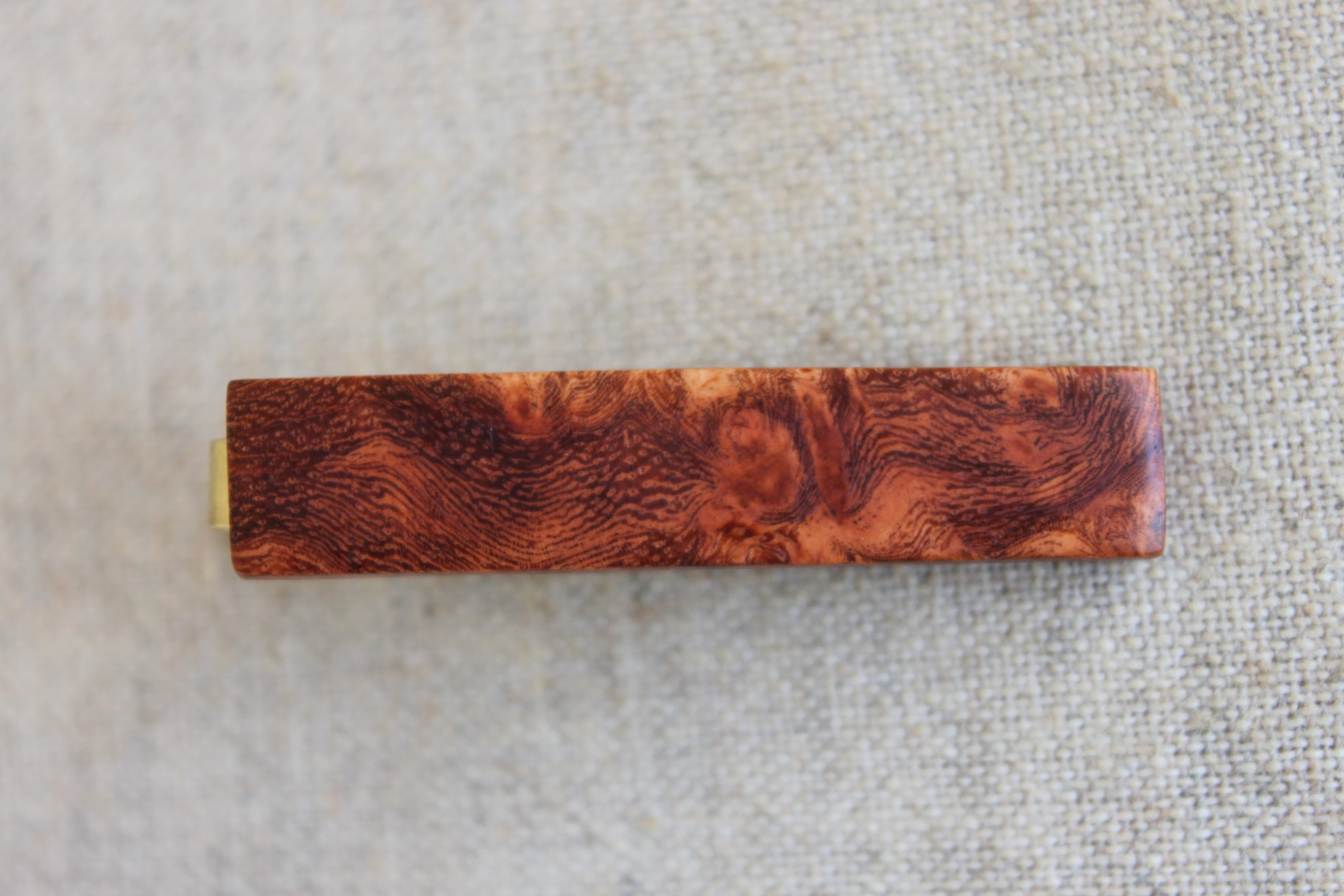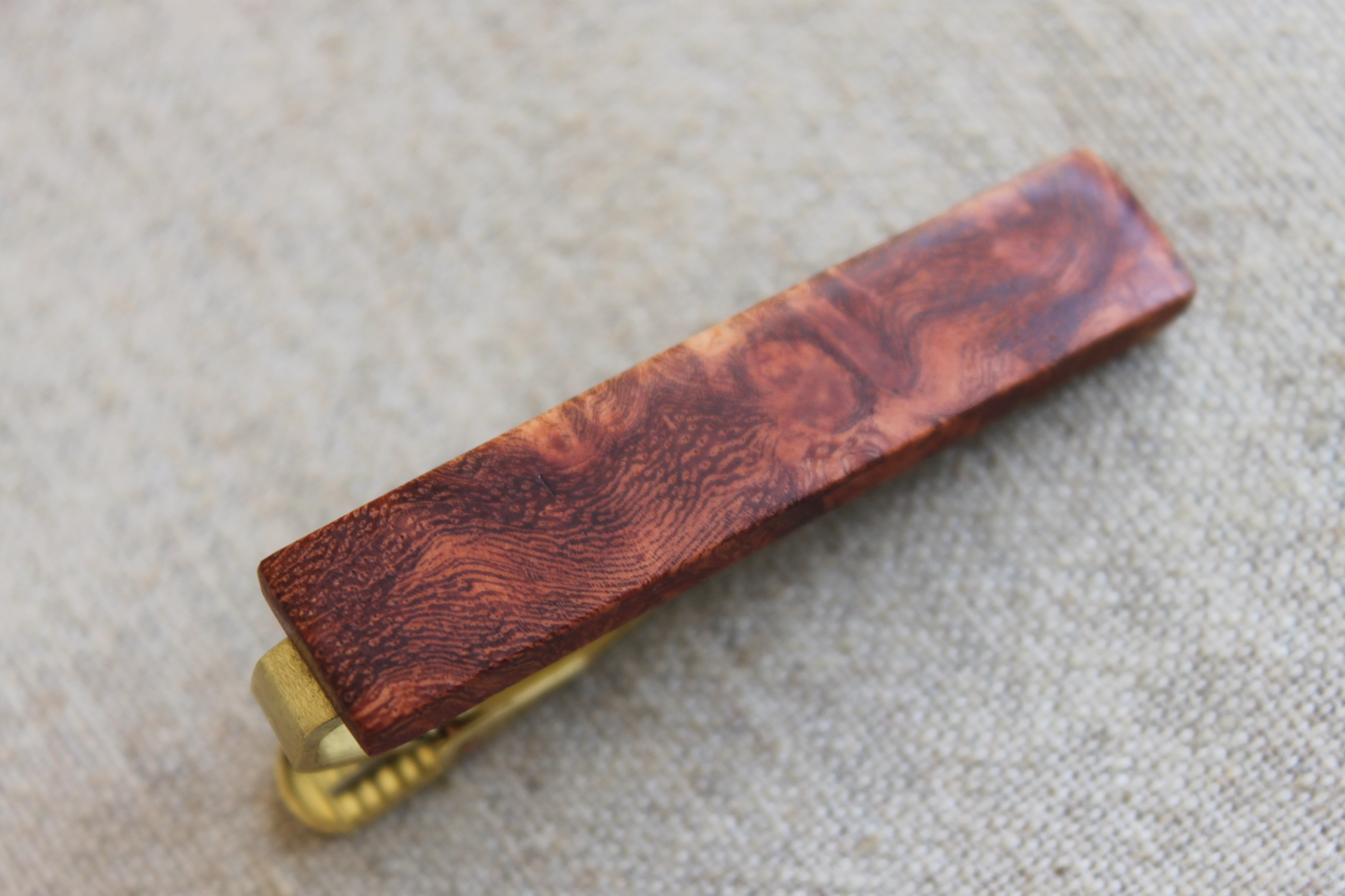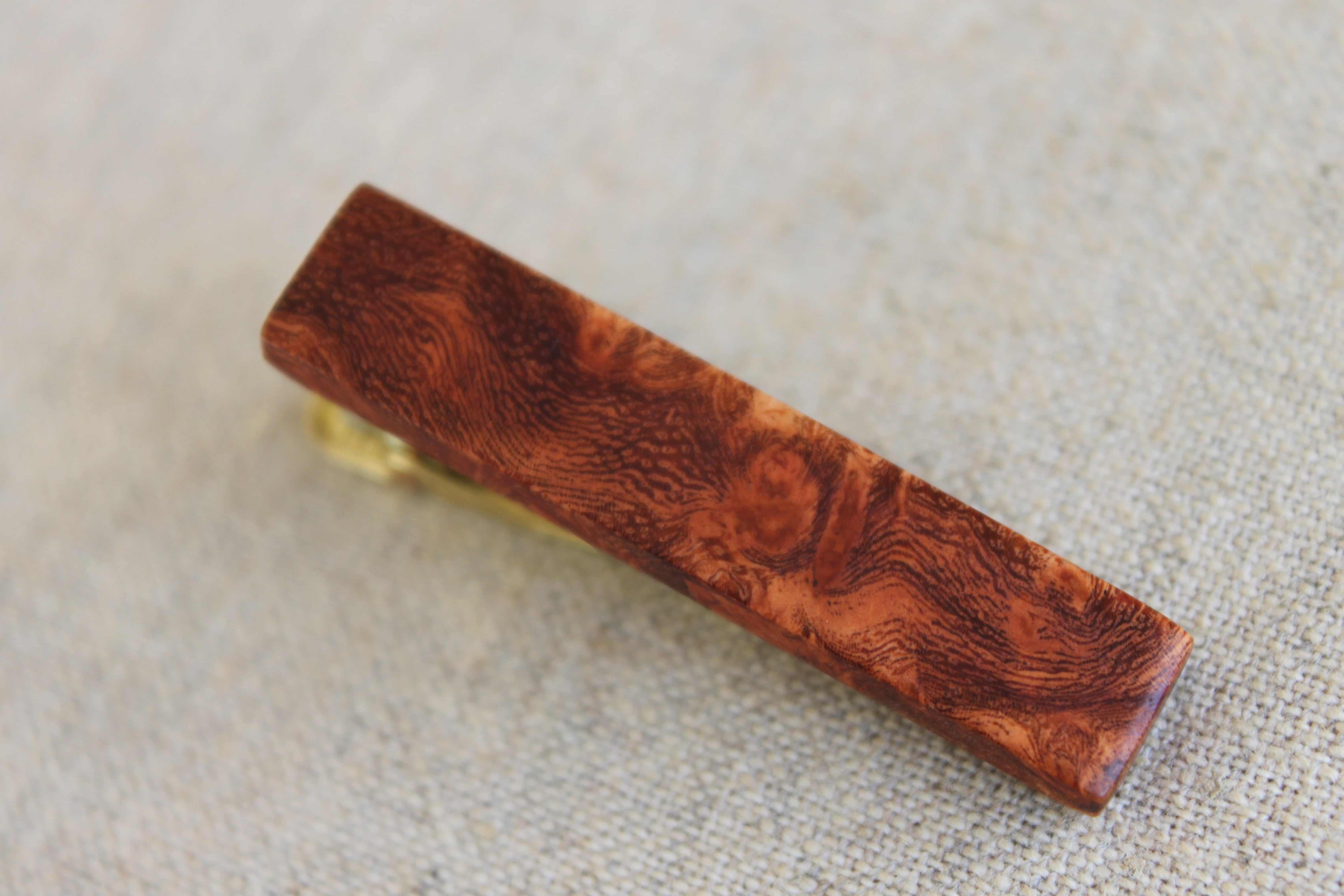 木材の木目、色を生かし丁寧に仕上げ深い光沢を持った他には無い一点物のネクタイピンです。