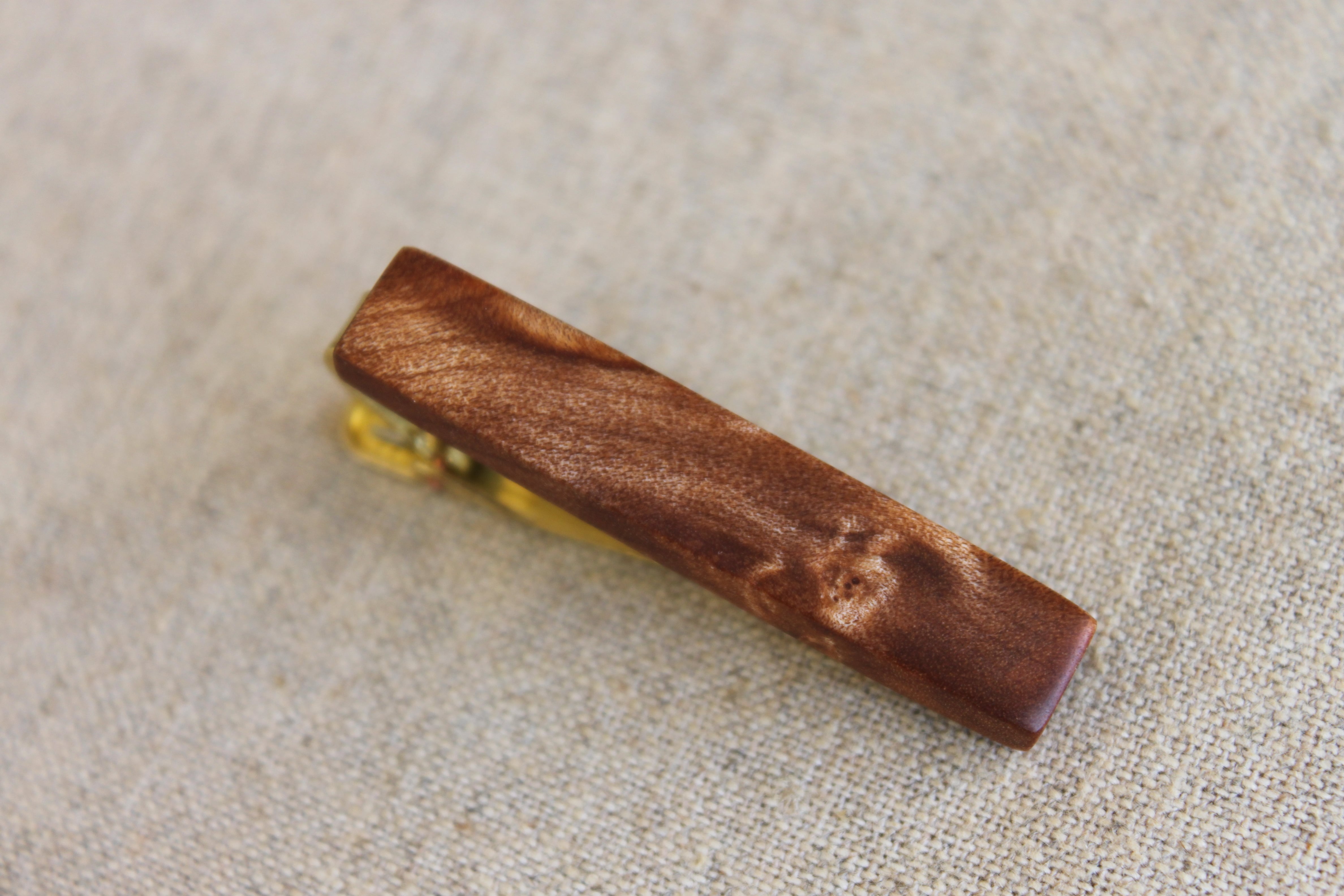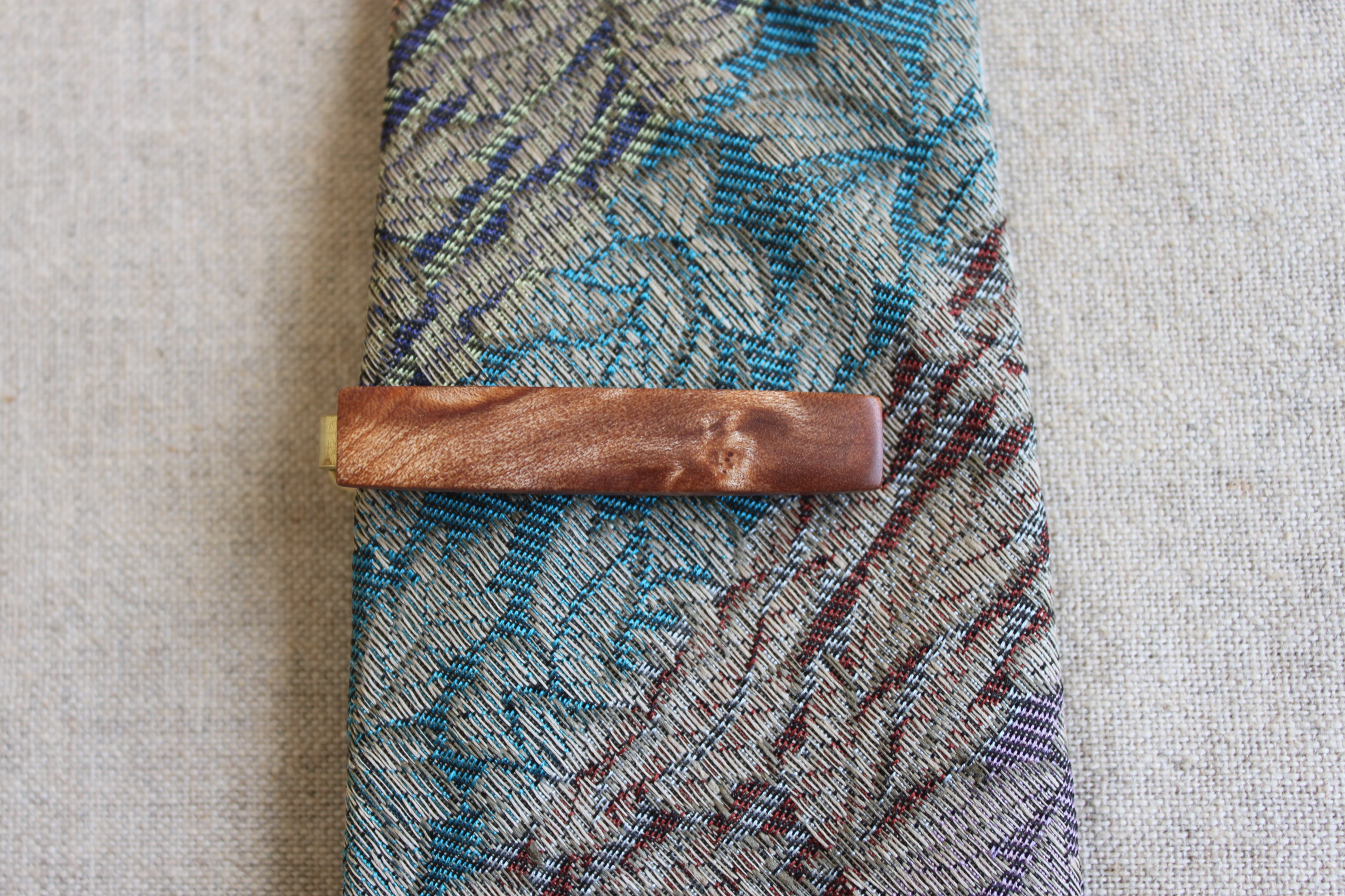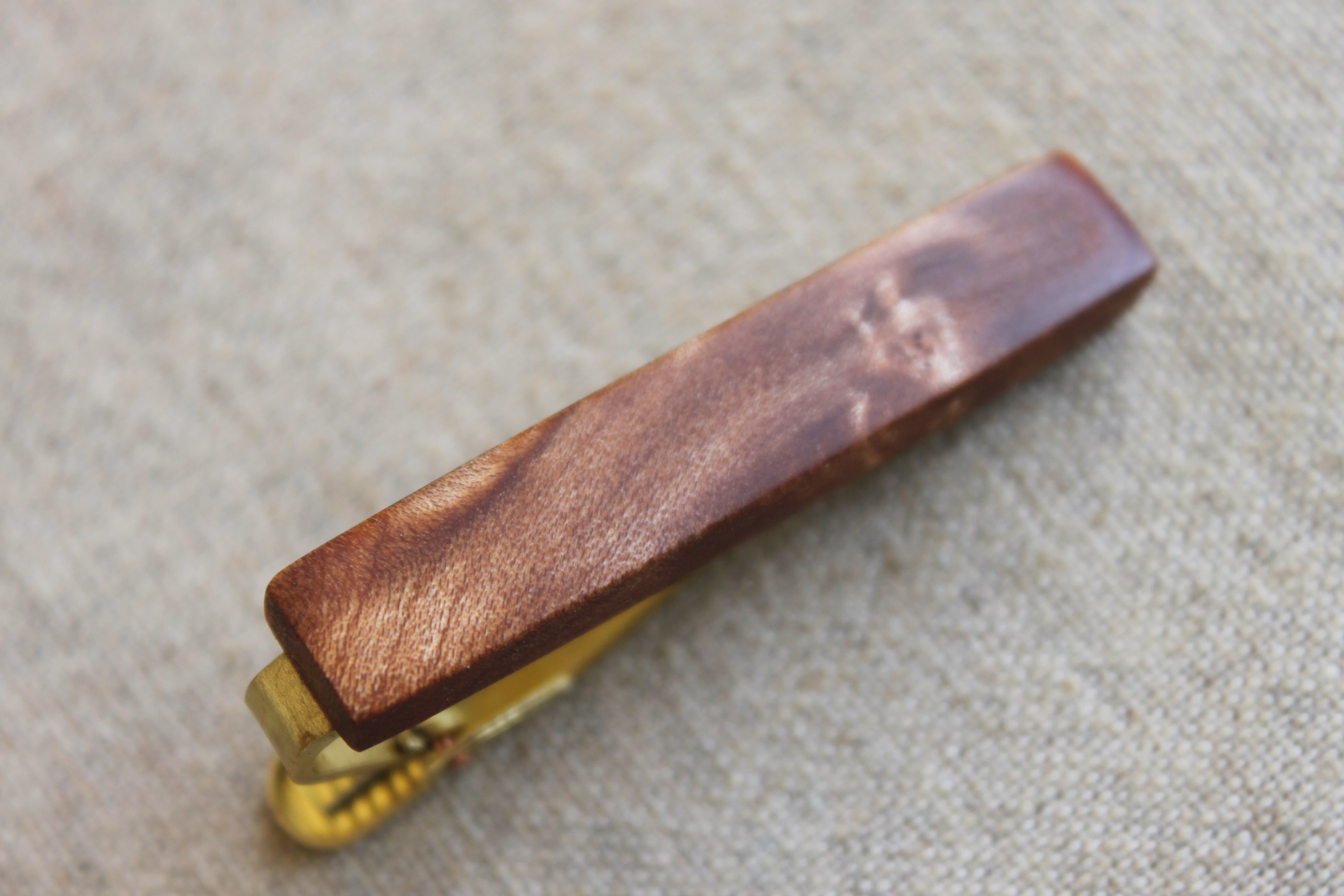 木材の木目、色を生かし丁寧に仕上げ深い光沢を持った他には無い一点物のネクタイピンです。