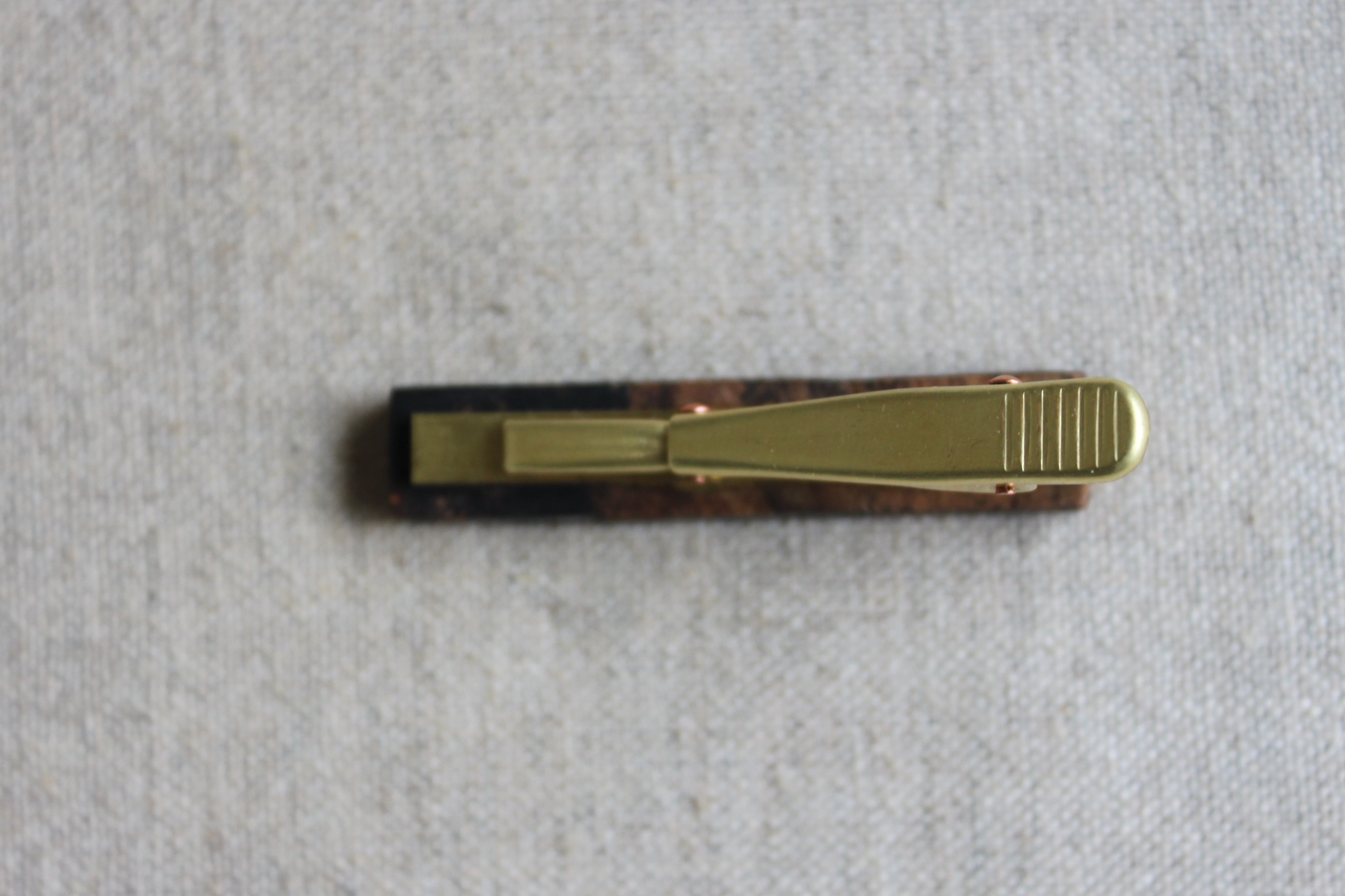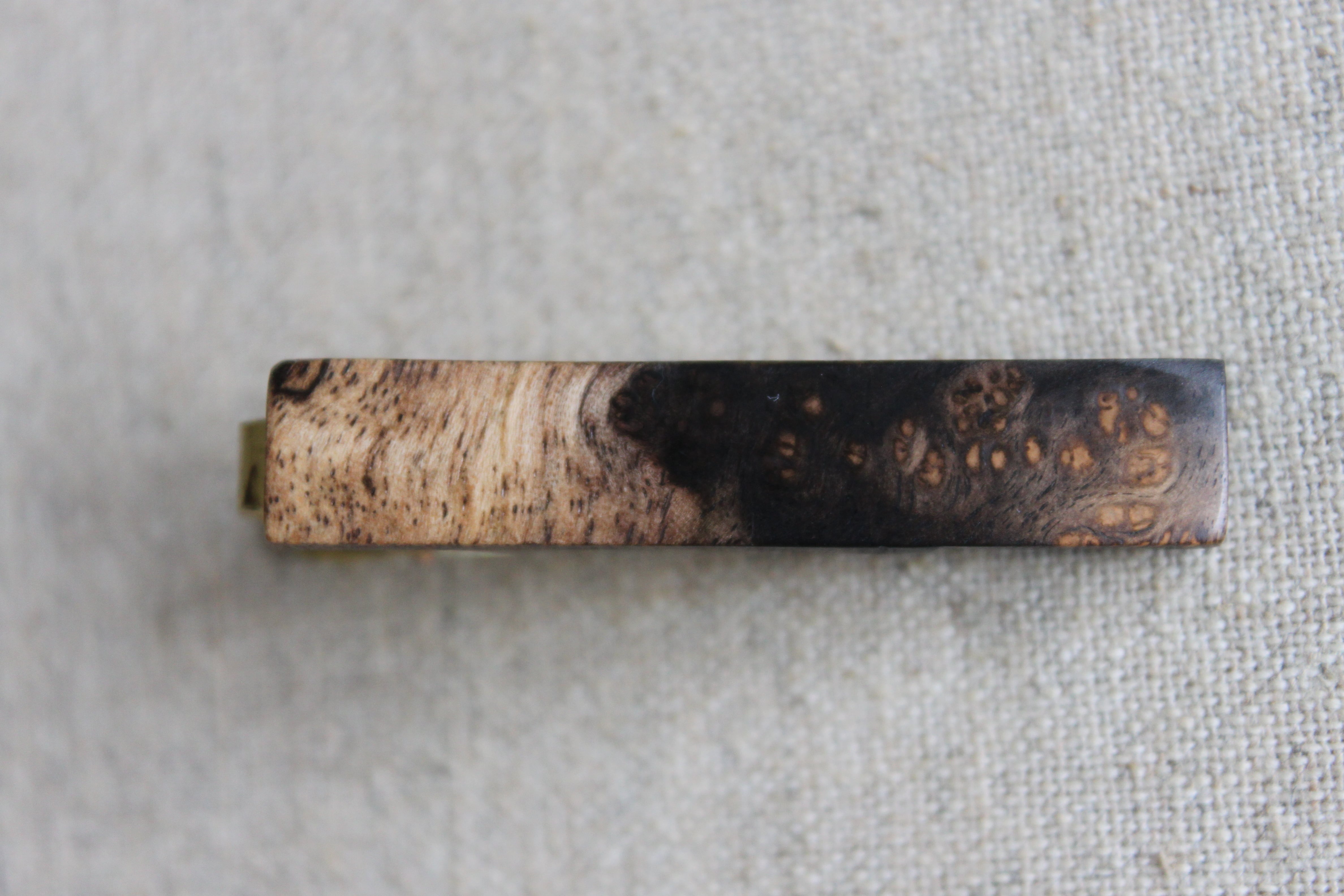 木材の木目、色を生かし丁寧に仕上げ深い光沢を持ったとても渋い他には無い一点物のネクタイピンです。